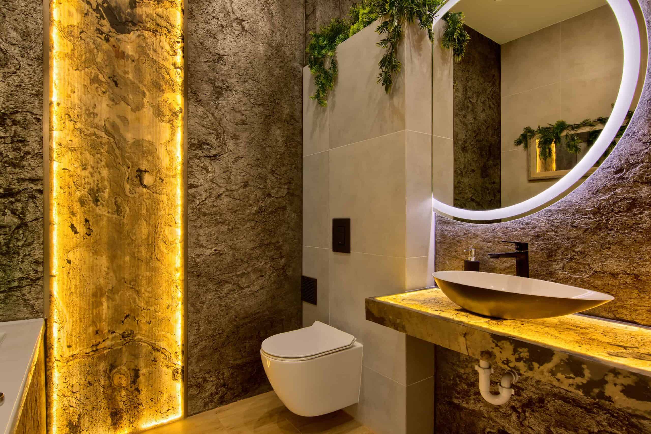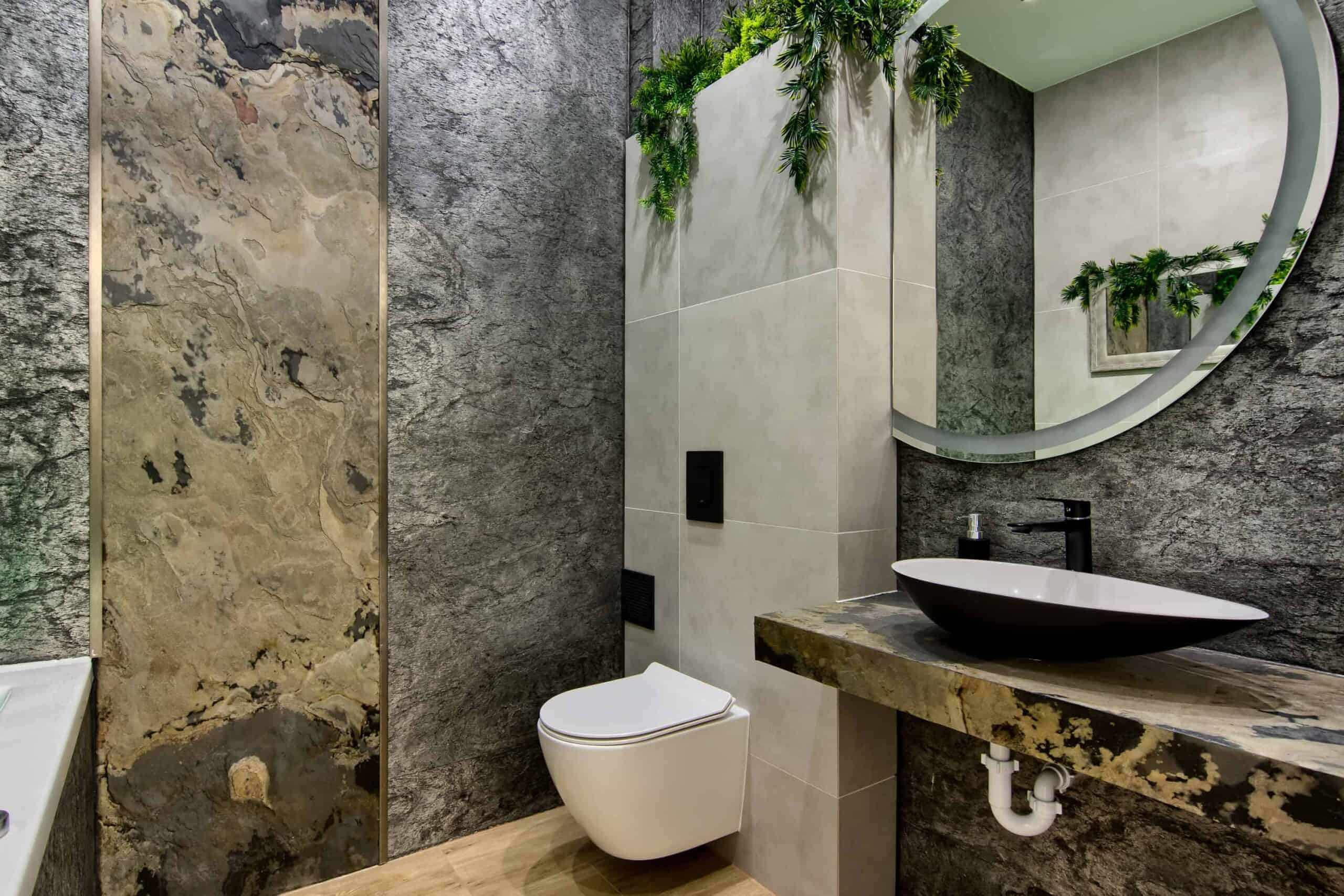 Z czego powstaje przezroczysty fornir kamienny? To cienka, elastyczna tapeta kamienna składająca się z kilku precyzyjnie dobranych warstw. Wierzchnia część to naturalny łupek o unikalnej strukturze, a pod nią znajduje się przezroczyste podłoże z żywicy poliestrowej, które pozwala na efektowne podświetlenie całości. Dzięki temu materiał idealnie sprawdza się w przestrzeniach zarówno suchych, jak i wilgotnych – takich jak łazienki, kuchnie czy recepcje – tworząc niesamowity efekt backlight.