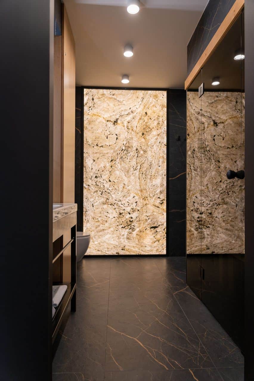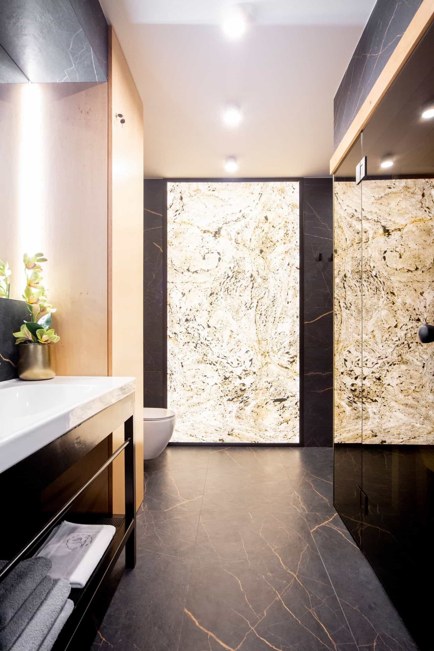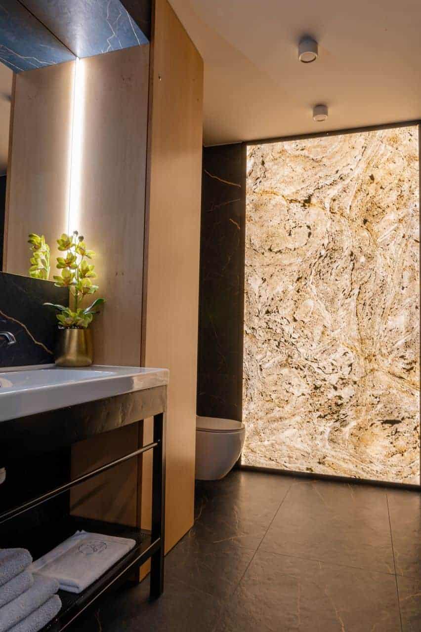 Z czego powstaje przezroczysty fornir kamienny? To cienka, elastyczna tapeta kamienna składająca się z kilku precyzyjnie dobranych warstw. Wierzchnia część to naturalny łupek o unikalnej strukturze, a pod nią znajduje się przezroczyste podłoże z żywicy poliestrowej, które pozwala na efektowne podświetlenie całości. Dzięki temu materiał idealnie sprawdza się w przestrzeniach zarówno suchych, jak i wilgotnych – takich jak łazienki, kuchnie czy recepcje – tworząc niesamowity efekt backlight.