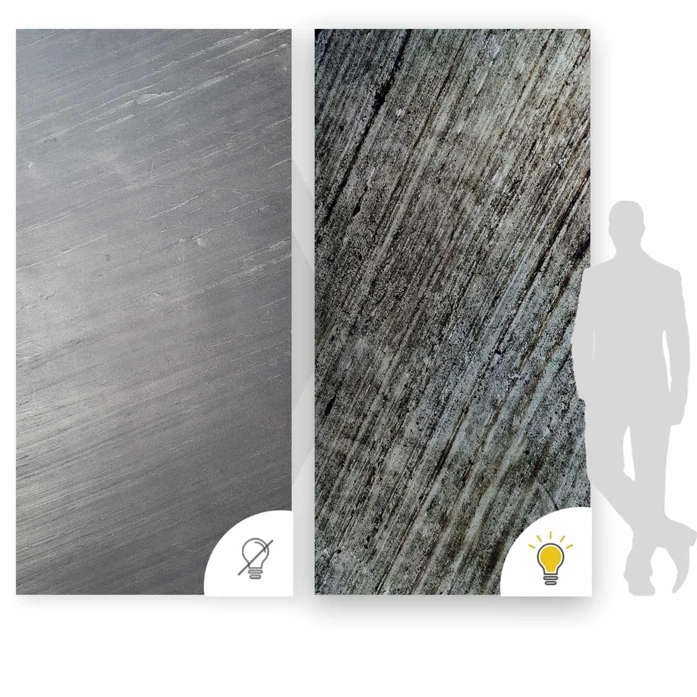 Z czego powstaje przezroczysty fornir kamienny? To cienka, elastyczna tapeta kamienna składająca się z kilku precyzyjnie dobranych warstw. Wierzchnia część to naturalny łupek o unikalnej strukturze, a pod nią znajduje się przezroczyste podłoże z żywicy poliestrowej, które pozwala na efektowne podświetlenie całości. Dzięki temu materiał idealnie sprawdza się w przestrzeniach zarówno suchych, jak i wilgotnych – takich jak łazienki, kuchnie czy recepcje – tworząc niesamowity efekt backlight.
